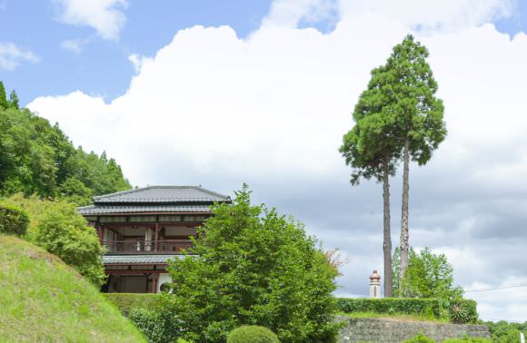 小高い丘の上にある北里柴三郎記念館。博士夫妻が植樹した2本の小國杉がシンボル