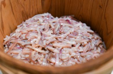 『木樽仕込いか塩辛』の原料は、近海もののいかと、いかごろと呼ばれるいかのはらわた、そして5%の塩分は赤穂の塩と少しの調味料。いかの身を傷つけずに1杯ずつ手で捌き、一晩塩漬けしてから細く切っていきます。醤油や酒、味噌などのように発酵のチカラに任せてつくるため、著色も一切なし。発酵中に出てきた色味をそのまま生かしたことで、小田島水産食品の塩辛は「桜色の塩辛」といわれるようになりました。通常なら2~3日の熟成で出荷されるところ、小田島水産食品の熟成期間は1週間。その間も1日1回、突き棒で突いて樽の中を撹拌し空気を入れ換えます。わずか數分間だけの作業ですが、小田島さんたちのこの作業が、杉樽に棲む酵母菌や乳酸菌を覚醒させ、自然の力を引き出すのです。