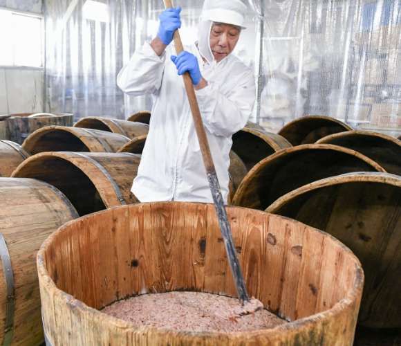 杉樽內での発酵を促すため、突き棒で塩辛を攪拌(かくはん)する小田島隆さん。伝統的な食文化を守る製法が評価され、魚が姿を変える過程を學ぶ小學生向けの書籍に、小田島水産食品の塩辛が掲載されている