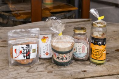 (寫真左)『木樽仕込』ほか、新潟出身の祖父母へのオマージュとして、唐辛子の発酵食品で新潟特産を加えた『かんずり入りいか塩辛』、自宅で簡単にアヒージョができる『塩辛deアヒージョ』など、バラエティ豊かなオリジナル商品