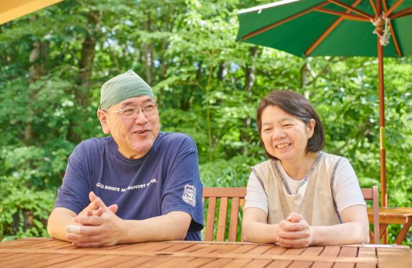 キャンプが好きという荒井浩嗣さん、紀枝さんご夫妻。「ここはキャンプ生活の延長みたいなものです」とほほ笑む