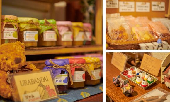會津の縁起物「起き上がり小法師」などをディスプレイされた店內では、地元でつくられたジャムも販売中