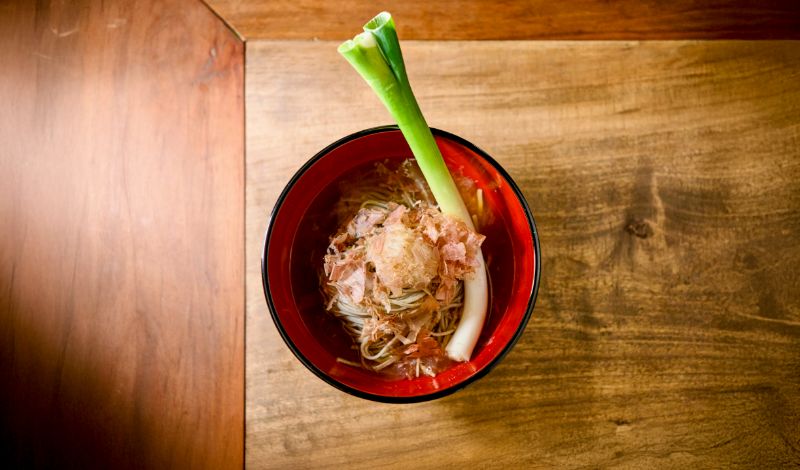 辛味大根のおろし汁に、焼き味噌を溶かして食べる『信州そば』から著想したのが三澤屋の『高遠(yuǎn)そば』です。三澤屋では、焼き味噌ではなく『かえし』をブレンド。お箸代わりに、北會(huì)津の契約農(nóng)家でつくられる『曲がりねぎ』ですくって食べるユニークさも人気です。Jの字に曲がったねぎは、成長(zhǎng)途中で土を盛り直してわざと形づけたもので、少しずつかじりながらそばを味わいます。毎日店頭で打つ出來(lái)たてのそばは地元南會(huì)津産の蕎麥粉と地下水で仕込んだもの。そば殻を含む田舎そばの風(fēng)味と歯切れの心地よさと、大根とネギのさわやかさが印象的です。