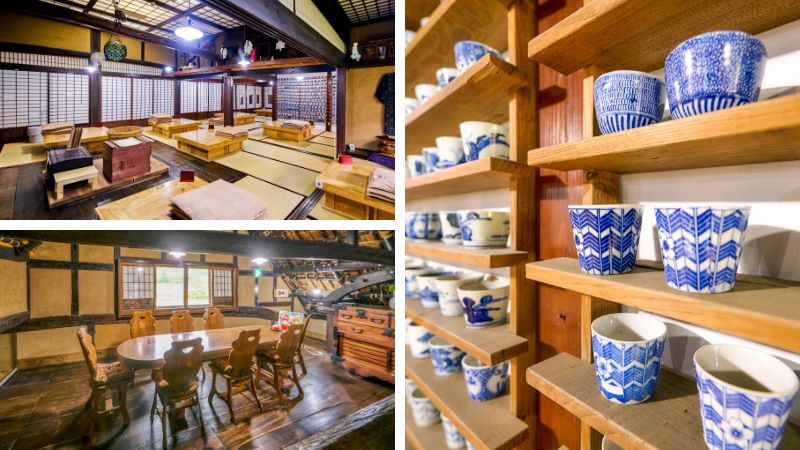 (寫(xiě)真左上、右)江戸時(shí)代の民家の雰囲気が満?jiǎn)摔扦氲陜?nèi)。大きな梁や柱、時(shí)代物の蕎麥豬口など、じっくり眺めたくなる素樸な裝飾ばかり
