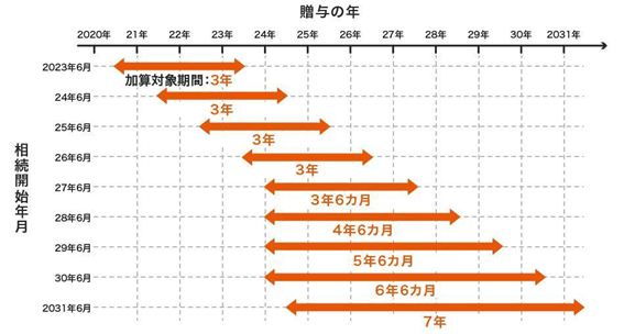 令和5年度稅制改正大綱において、「生前贈與加算」の対象期間が3年から7年に延長されました。生前贈與加算とは、亡くなった人から存命中に受けた贈與(生前贈與)について、相続した人の相続稅課稅額に対して、死亡前7年間 さかのぼって加算する規定です。4年以上の生前贈與加算が始まるのは2027年(令和9年)1月1日以降、7年分の加算が開始されるのは2031年(令和13年)1月1日以降の相続です。