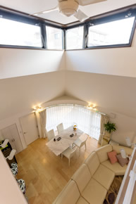 3階ホールから見下ろしたLDK。天井近くの窓から明るい光が室內(nèi)に降り注ぐ