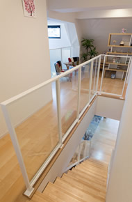 透明ガラスの手すり壁が開放感を生む3階のホール。ご夫妻がチョイスした家具が置かれ、おしゃれな空間に