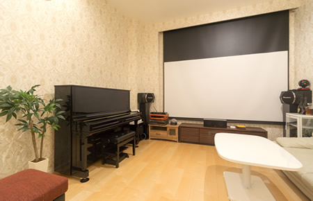 1階のシアタールーム。天井高3mの空間にある大きなスクリーンで、映畫やコンサート映像を楽しまれているとか
