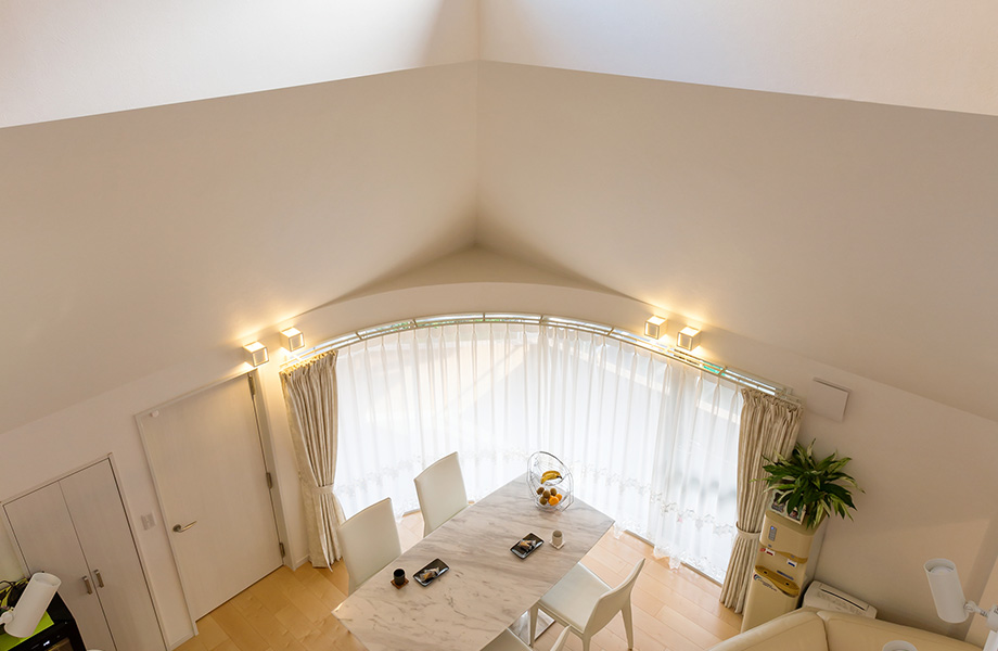 3階ホールから吹き抜けのLDKを見下ろした眺め。天井近くの高い窓から陽光が明るく差し込む。「ソファーに座っているだけで開放感に包まれます」とCさま。広々としたLDKをお子さん達(dá)も走り回って楽しそうです。