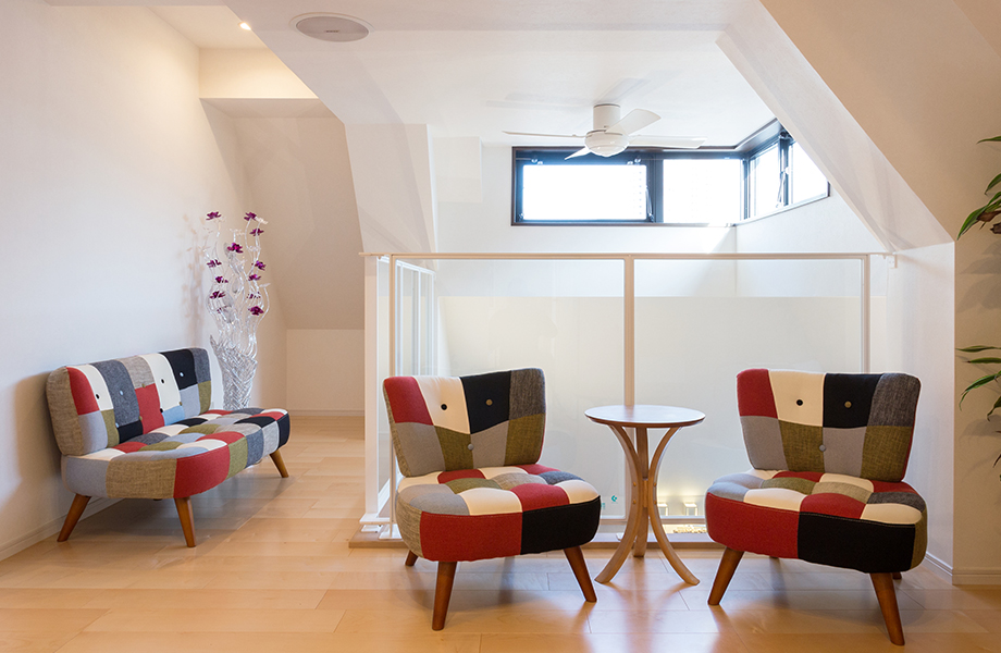カラフルな椅子が似合うお灑落なカフェスペースとなり、リビングから見上げたときも素敵な印象です。天井近くの窓から外の景色が眺められるのも気持ちがいいポイントです。