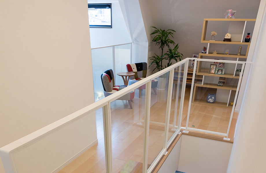 3階のホール。部屋の壁を取り払って、ホテルのラウンジのような雰囲気に。透明ガラスの手すり壁で視線を通し、吹き抜けのリビングを見下ろす心地よさを創(chuàng)り出しています。