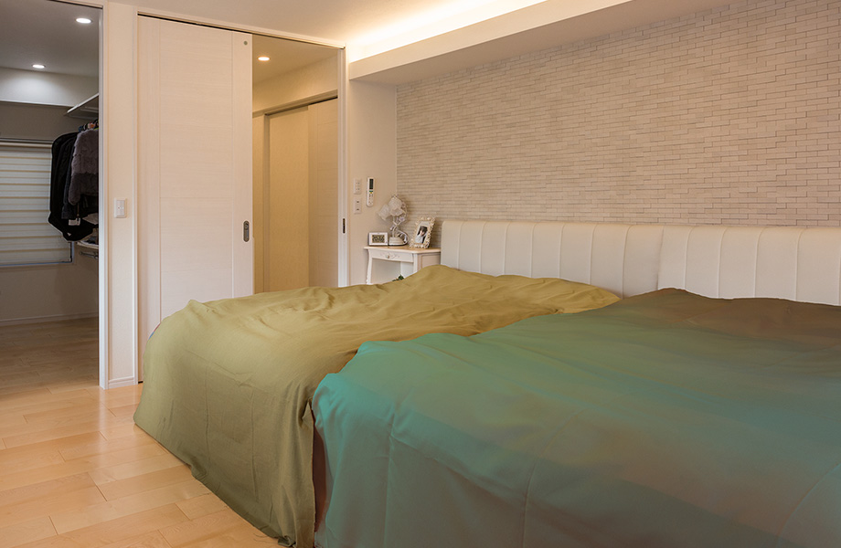 3階?主寢室。天井にL字型に下がり天井をつけて、間接照明を組み込み、優(yōu)美な明かりの演出をしています。壁にはオフホワイトの「エコカラット」を貼り、気品のあるインテリアのアクセントに。隣接して広いウォークインクローゼットと、パウダールームも設(shè)けています。