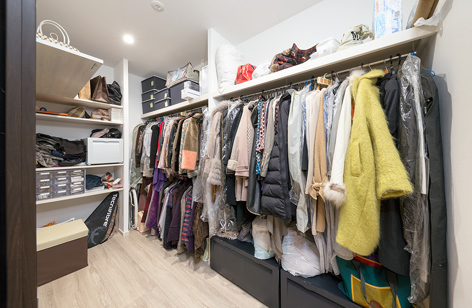 以前から収納は隨所にありましたが、使いやすく片付けやすいようにリビングの一角に大容量のウォークインクローゼットを設(shè)けました。衣類やリビングまわりで使うものなどがまとめて片付けられ、リビングを美しく保つのに役立っています。