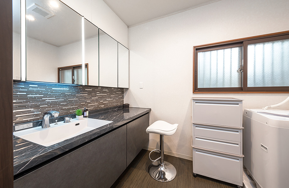 洗面室も一新し、リビングとトーンを合わせてダークな色の洗面臺をセレクト。鏡の下にはタイルを貼って落ち著いた色調(diào)の仕上がりに。床には素足でも心地良い籐のフロアタイルを採用しています。窓は二重窓にし、斷熱性能を高めました。