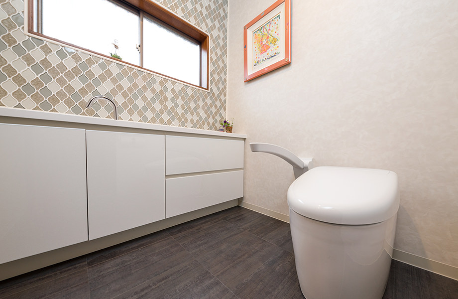 もともと広かったトイレは少し縮小して一部を収納にし、程よい広さに変更。たっぷりと入る壁面収納を設(shè)け、O様が気に入られたタイルを使ってコーディネートし、気持ちよく過ごせる空間へと変わりました。