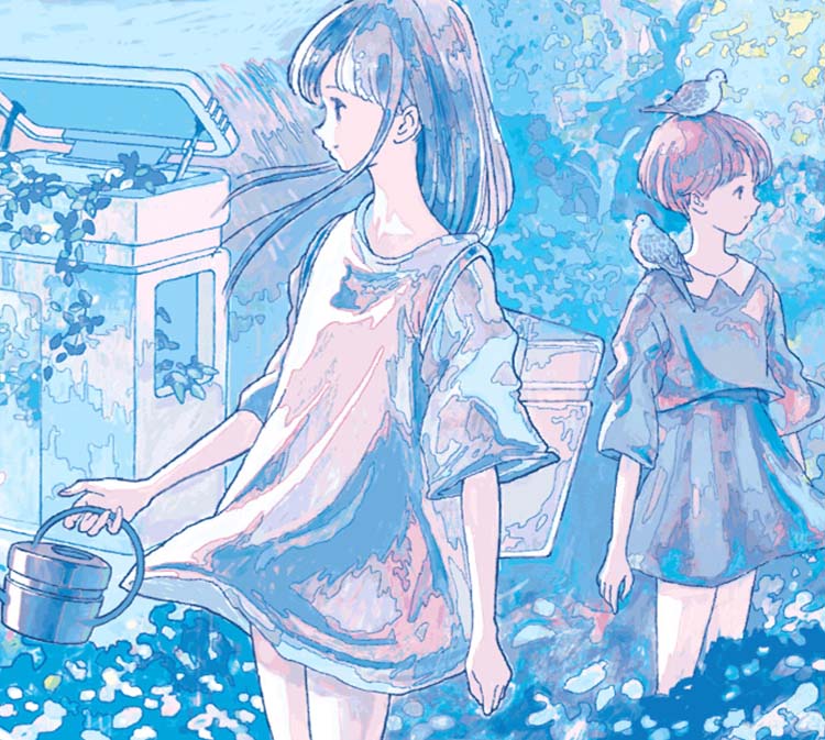 青色を基調にゲーム機と女性をモチーフに取り入れた透明感のあるイラストや立體作品を手掛ける。書籍、音楽、製品パッケージなどのカバーアートも多數制作。