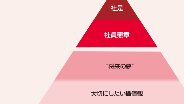 私たちの理念體系は、“いつの時代も変わらない”「社是」「社員憲章」と、“時代に合わせて変化していく”「將來の夢」「大切にしたい価値観」の2軸で構成されています。