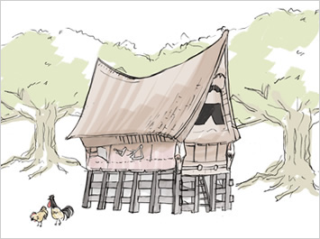 バタク?トバの家を見たとき、まず目に入るのが大きな鞍形切妻屋根です。家の出入口から見ると、開いた本を逆さにしたような切妻屋根の特徴が見て取れます。また、橫から屋根を見ると、まるで馬の背中にのせる鞍のような形をしていることがわかります。屋根部分を前後に突き出た形にすることで、やじろべえのように柱の上でバランスをとって安定させているのです。この突き出た屋根は日陰を作る役割もしています。
