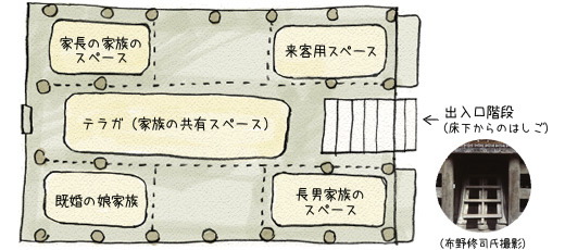 テラガの左右のスペースは、家族の數によって4~6つに分かれています。右手後方は「ジャブ?ボナ」と呼ばれる家長のスペース。入口すぐの左手は長男家族が使用する場所である「ジャブ?スハット」というぐあいに、間仕切りのない部屋でもそれぞれ使うスペースが決められています。