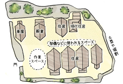 1つの集落はそれほど大きくはなく、家の數は4~6棟ほど。鞍形屋根の家と向かい合うように「ソポ」と呼ばれる倉が建っています。家の後方では野菜などが栽培されています。集落の前にはバンヤン(ガジュマル)の木、門の近くには集會や作業のスペースがあり、長方形の集落の中央には、結婚式や葬式など祭儀のときに使われる広いスペースが設けられています。