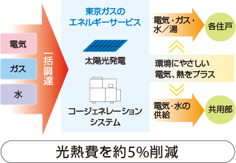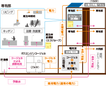 マンションの敷地內には、太陽光発電システム(10kW)と、ガスコージェネレーション(25kW)を設置。天候や時間帯に左右される太陽光発電をガスエンジンによる発電が補い、共用部と各住戸の一部電力を自給するとともに、停電時にはエレベーターや共用部の照明などを機能させることも可能です。さらに、ガスコージェネレーションで電気を創り出す際に、同時に発生する熱を利用して貯湯槽で予熱水を作り、各戸の給湯器へ供給。少ないガスでお湯を沸かすことができ、省エネです。