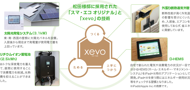 當(dāng)社グループでは生活の質(zhì)を向上させながら、2020年までに環(huán)境負(fù)荷「0(ゼロ)」(CO2排出量をゼロ、光熱費(fèi)をゼロ)となるエネルギー自給住宅に進(jìn)化させるための新プロジェクト「Smart xevo Eco Project(スマート?ジーヴォ?エコ?プロジェクト)」をスタート。2010年7月に國內(nèi)初となる家庭用リチウムイオン蓄電池付住宅展示場(chǎng)「スマ?エコ ハウス」をオープン、2011年10月にスマートハウスの商品化第一弾となる「スマ?エコ オリジナル」を発売しました。2012年春、?スマ?エコ オリジナル?をご購入いただいた大阪府の松田様を訪ね、入居後の感想をおうかがいしました。