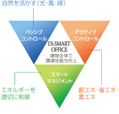 當社の新築事務所では、次世代の環境配慮型オフィス「D's SMART OFFICE(ディーズ スマート オフィス)」のコンセプトに基づき、最新の環境配慮技術を導入、効果検証を行っています。