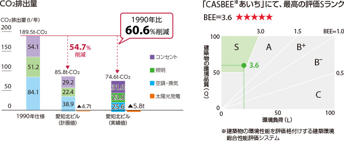 2010年より、CO2排出量の半減とZEBの実現を目指すプロジェクトを始動。既存オフィスのCO2排出量は、2011年度に2005年度比34.2%削減。新築した「愛知北ビル」では、先導的な環境配慮技術の導入と「省エネ改善委員會」により、初年度のCO2排出量が1990年仕様比60.6%削減となったことが高く評価されました。