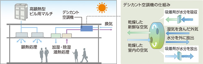 「デシカント空調システム」は、冷房時は外部給気の濕気を吸著して外部に排気。暖房時は、逆に室內排気と外部給気の濕気を室內に還流することで濕度を調節し、快適な室內環境とランニングコスト削減を実現できました。