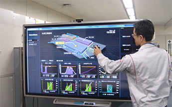 「D's FEMS」では、電力だけでなく生産量や設備異常、作業環境、防災など作業者?管理者の関心が高い內容をリアルタイムに、わかりやすく大畫面に表示させています。