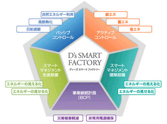 こうして商品化された「D's SMART FACTORY(ディーズ スマート ファクトリー)」は、「パッシブコントロール」「アクティブコントロール」「スマートマネジメント(生産設備)」「スマートマネジメント(建築設備)」「事業継続計畫(BCP)」という5つのコンセプトを持った次世代環境配慮型工場です。