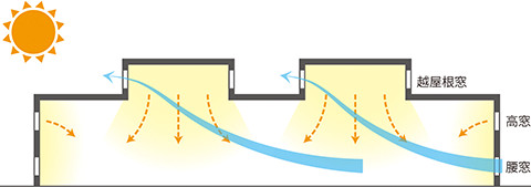工場の窓の位置や仕様、屋根形狀を工夫することで、自然光や通風を最大限利用し、照明電力や排熱動力を削減しています。