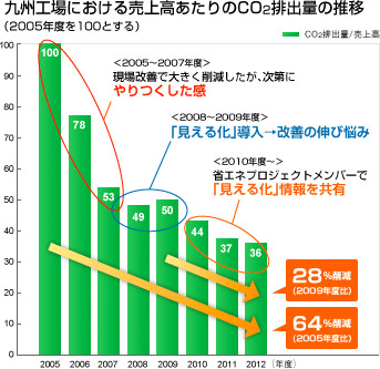 その結果、2012年度末にはプロジェクト発足前と比べて、売上高あたりのCO2排出量が28%削減(2009年度比)、活動を始めた當初と比べると、同64%もの削減(2005年度比)になりました。