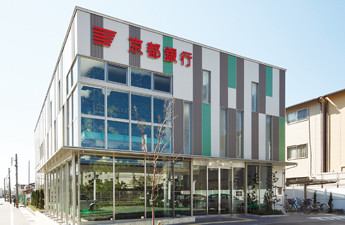 京都銀行東長岡支店の新築移転において、環境配慮型店舗のご依頼を受け、総力を挙げて取り組みました。物販店舗で実現してきたD's SMART STOREのノウハウや素材?部材メーカーとの共同開発による新しい省エネアイテムなど、最大限の工夫を盛り込み、同規模の従來型店舗に比べCO2排出量を約4割削減。さらにお客さまのご希望で、當初予定を上回る太陽光発電パネルの増設を行い、銀行店舗としては日本初となるCO2排出量ゼロを実現。徹底した環境配慮のみならず、快適性も高まった、これまでにない新しい銀行店舗が生まれました。