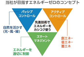 當社では、『先端技術でエネルギーをカシコク使う』をコンセプトに、エネルギーを適切に制御する「スマートマネジメント」、自然の力を活かす「パッシブコントロール」、創エネ?省エネ?蓄エネを実現する「アクティブコントロール」の3つをキーワードとして、「スマートマンション」を推進しています。