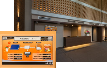 マンションの屋上に30?の太陽光発電システムを設置。発電された電力は、マンションの共用部へ供給しています。また、災害時には自立運転に切り替わり、専用コンセントへ供給し、攜帯電話やパソコンに利用できます。