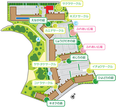 四季の移ろいが美しい「三色彩道」に面した敷地面積29,000㎡超の場所に「プレミスト北千里クラッシィ」は竣工しております。敷地內には、エリアごとにテーマ性をもったコミュニティスペースが多數あり、桜や紅葉を愉しんだり、緑の中の散策路を歩いたりと、豊かな緑を活かした交流の場を設け、ご入居者さまにご利用いただいています。