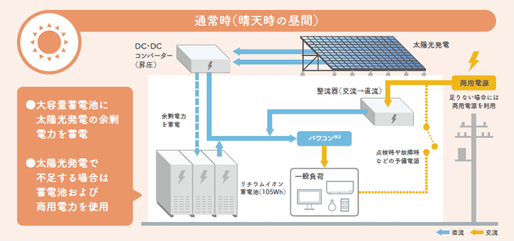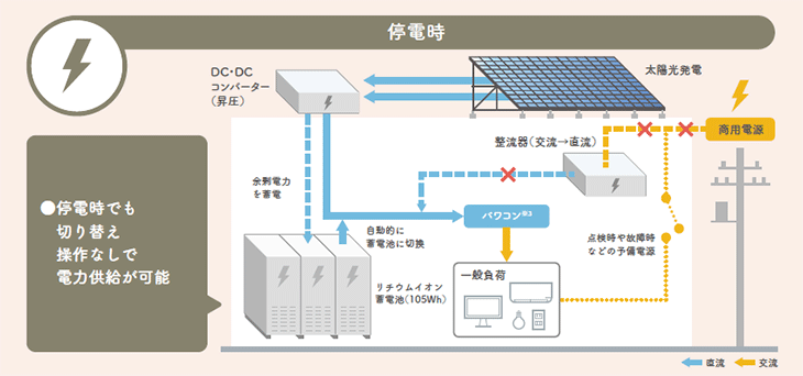 一般に停電により商用電源の交流電流がなくなると、通常のパワコンは機能できなくなります。佐賀ビルでは、太陽光発電と蓄電池を直流回路でつなぎ、商用電源を直流変換し直流回路に流して受電するという獨自の方式を採用。停電時でも自立して運用できるように設計しています。
