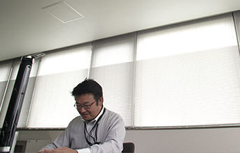 窓から取り込んだ自然光を採光ブラインドや天井、壁の反射率の高い採光クロスにより、室內の奧まで屆かせている。