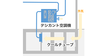 地下にはクールチューブピットを設け、外気をピット內に通すことで地中の熱を利用し、空調負荷を低減しています。また、風を使って冷溫水を作ることができる空冷チラーも搭載しています。