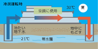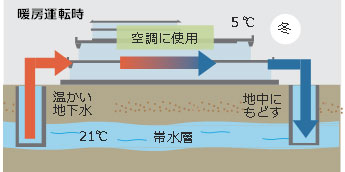 年間を通して一定の溫度を保つ地下水を、建物の空調に利用する帯水層蓄熱システム?ATES?を採用しました。冷房運転時には外気溫度と比較して冷たい地下水を、暖房運転時は暖かい地下水を井戸から揚水して「熱のみ」を利用し、帯水層へ全量還水しています。空調時の排熱を大気に放出しないため、ヒートアイランド現象の緩和にもつながります。