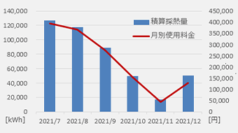 ATESからの熱供給量をすべて空冷ヒートポンプチラーに置き換え試算。エネルギー使用合理化等事業者支援補助金にて使用されているパッケージエアコンの月別使用想定とBEMSで測定した7~12月の実績値(左図)より年間使用熱量及び削減電力料金を試算。電力料金は関西電力高圧電力ASの値を採用
