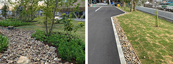 浸透率が通常の約9倍のレインガーデン土壌を使うことで、雨水を土の中に浸透させることができます。そのため、ゴミが溜まりやすく、直接敷地外に放流するコンクリート製の排水側溝を用いる必要がありません。