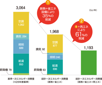 省エネ設(shè)備については、潛熱回収型ガス給湯器(エコジョーズ)、高効率エアコン、LED照明(共用部含む)等を採(cǎi)用し、住棟全體で約35%の一次エネルギー消費(fèi)量を削減しました。