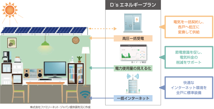 さらに、太陽(yáng)光発電システムと當(dāng)社のスマートマンションサービス「D's エネルギープラン※」を組み合わせ、高圧一括受電サービスと電力使用量の見(jiàn)える化、インターネット環(huán)境の整備を一體で提供するスキームを採(cǎi)用しました。余剰電力の売電によって得られた収益を、インターネットサービスの使用料やエネルギーマネジメントシステムの維持費(fèi)へ充當(dāng)することで、入居者さまにとっても、分かりやすく経済メリットを享受いただくことができるようになりました。