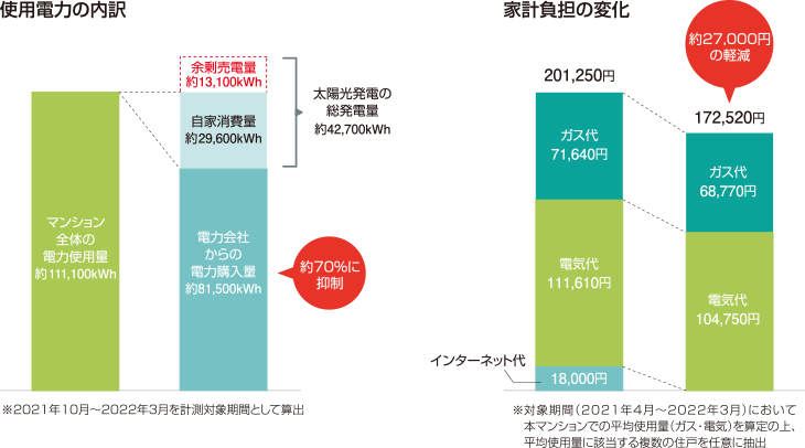 これらの取り組みによって、電力會(huì)社からの電力購(gòu)入量を約70%に抑制(年間約19,000kgのCO?排出量削減に貢獻(xiàn))、入居者さまの家計(jì)負(fù)擔(dān)を年間約27,000円以上軽減しています。(※株式會(huì)社ファミリーネット?ジャパン調(diào)べ)