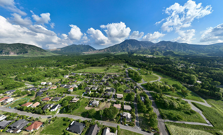 阿蘇山やくじゅう連山などの火山群、また、その周辺に広がる雄大でなだらかな草原で構成される阿蘇くじゅう國立公園。阿蘇五岳の最高峰である高岳のふもとに位置する分譲地「ロイヤルシティ阿蘇一の宮リゾート」では、1999年の販売開始以來、森を間借りする暮らし“暮らす森”として、200世帯を超えるお客さまの暮らしに寄り添いながら、コミュニティ作りやインフラの整備、環境保全に長年取り組んできました。
