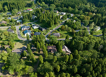 自然地形を活かした住宅地。まちづくり憲章(環境保全規定)を制定し、住民の方々と共に草原を育成するエリア。各住宅の庭は、管理樹木を選定し、あらかじめ植樹しているほか、沿道においては、阿蘇の草原の優占種であるススキなどの高莖草をはじめ、野芝、チガヤなどの中?低莖草を育成しています。沿道の維持?管理については、専門家のアドバイスをもとに、それぞれの草木が育ちやすい草刈り頻度を設定し、草原育成に限定した管理費をいただきながら、當社で定期的な管理を実施しています。