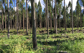 隣接地も含めた生態系調査の結果、過去、このエリアは畑として使用されたのち、人工的にスギ?ヒノキ等の針葉樹の植林が進められていたことが判明しました。この結果および、既存街區のオーナーさまとの意見交換の內容も踏まえ、荒廃が進んでいる針葉樹林を大きく草原エリアと樹林エリアに分けて、元來阿蘇が有する生態系の再生に向け、間伐や植栽を進めました。