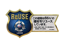 外壁の汚れや小さな凹みなどがあっても品質に問題がなければ新品への入れ替えや過度な整備は行いません。リユース店舗の取り組みは、使えるものは原則再利用することによって環境負荷低減に貢獻しています。ローソンさま獨自のリユースステッカーは、店舗の外壁に貼られ利用するお客さまに対しても環境価値をアピールしています。